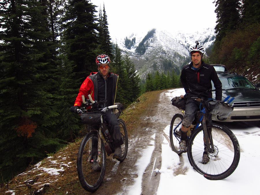 The current leaders are Ollie Whalley from Christchurch, New Zealand and Craig Stappler from Alberta, Canada. Here they are crossing Richmond peak in Montana earlier in the week. One slip in their bike shoes on that snow and it is a looong slide down the mountain side!